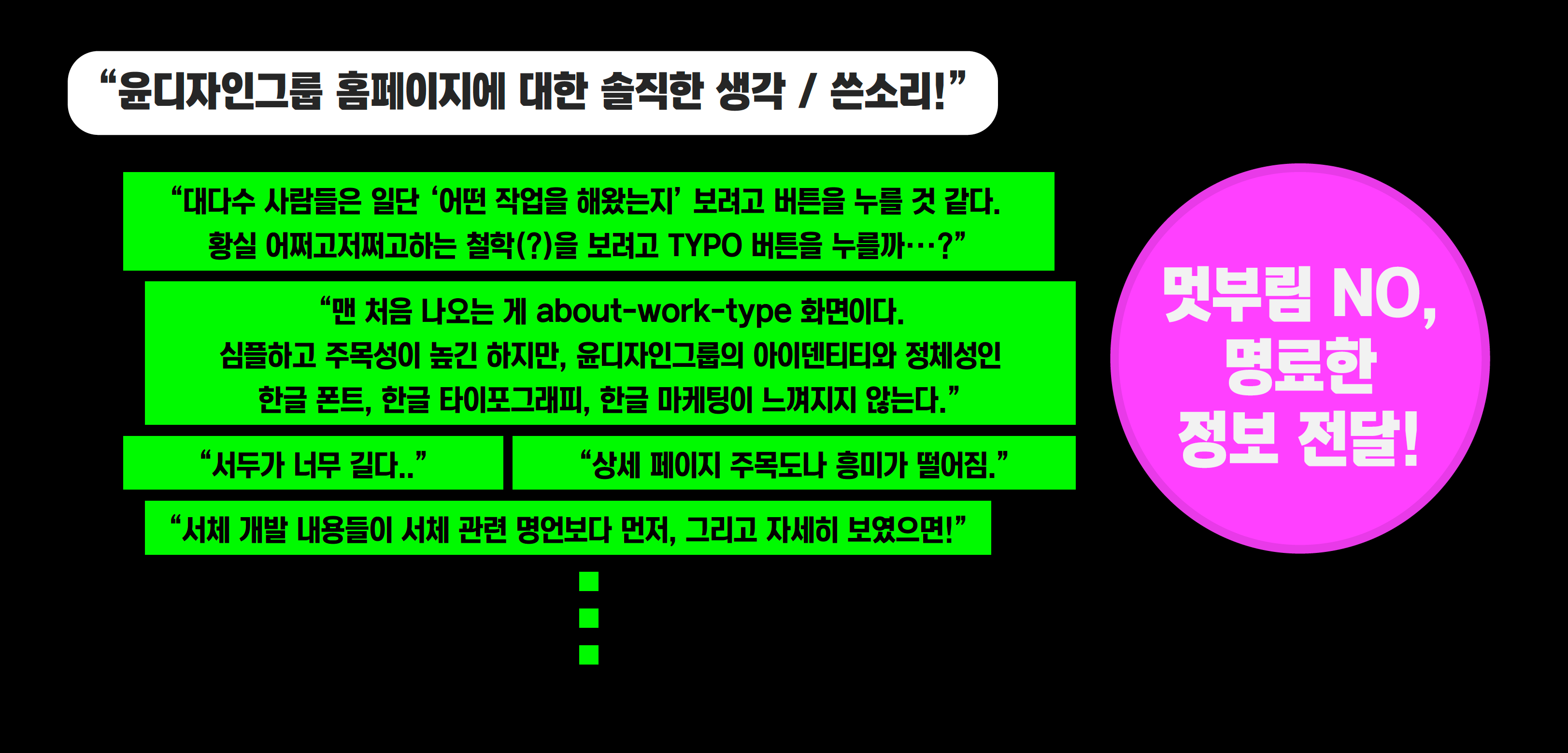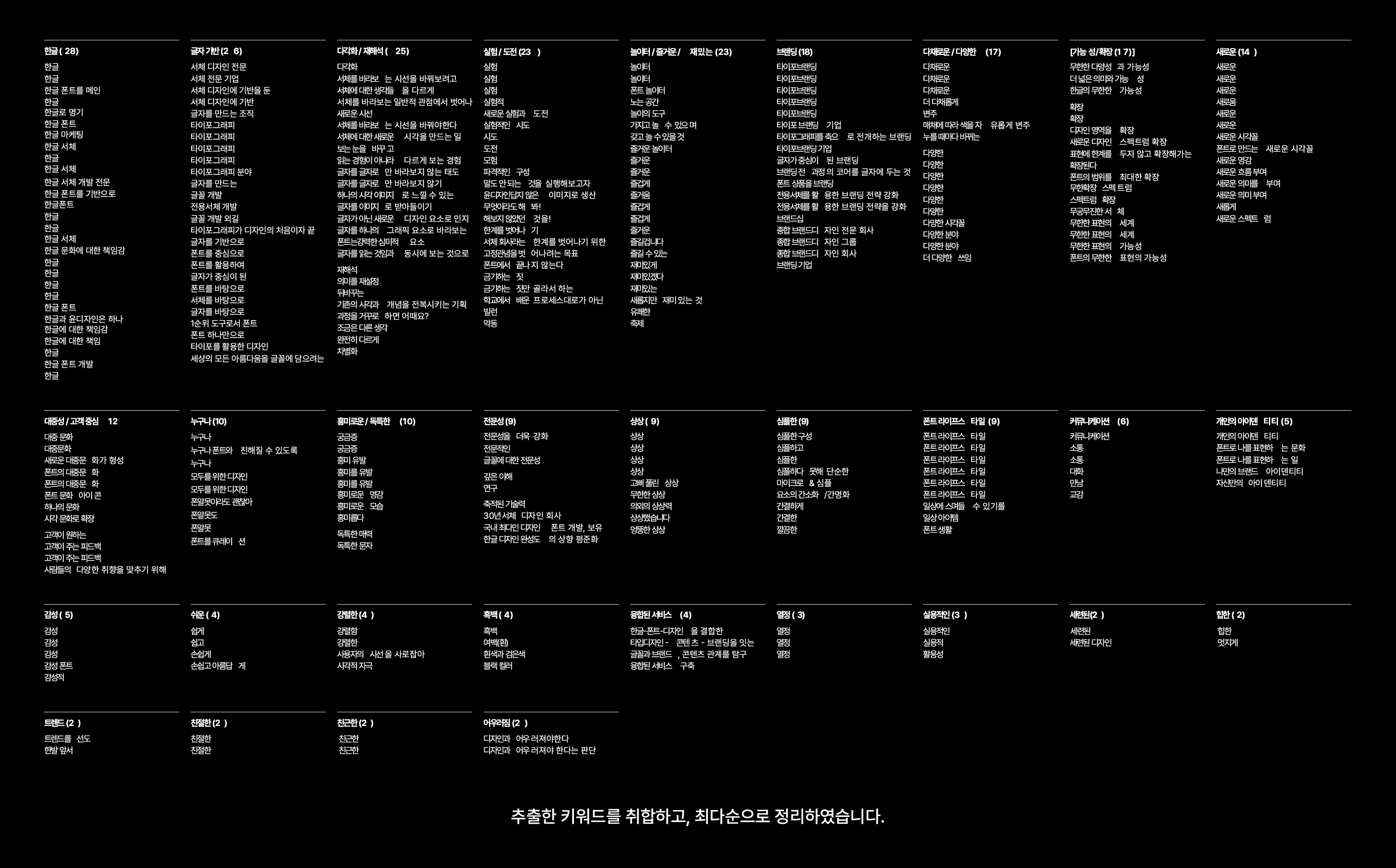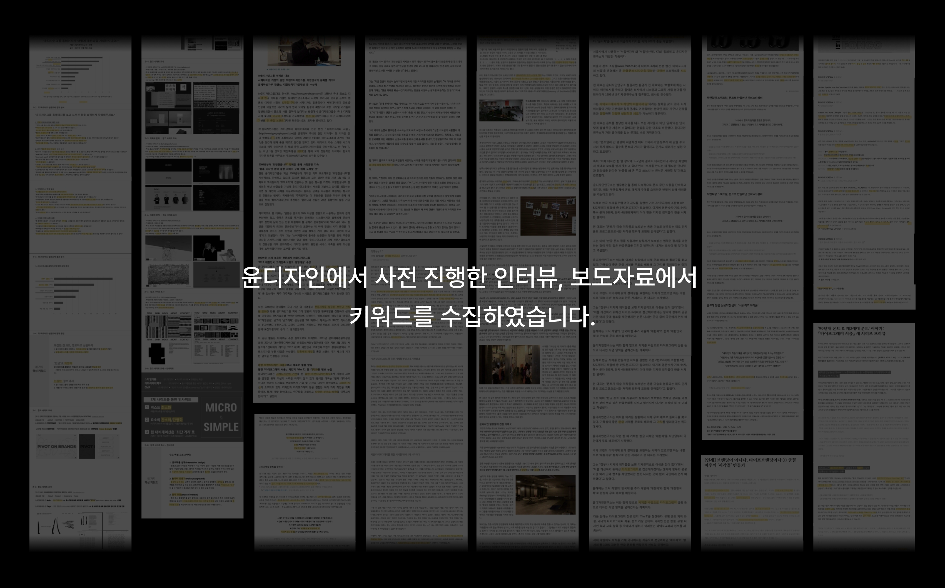 저희는 2번 옵션을 택했습니다. 그래서 아쉬웠어요. 하지만 외주사 1차 보고 때 만족스러움으로 바뀌었습니다. 외주사에서 아이덴티티 디자인 작업에 준하는 브랜드 분석 자료를 들고 왔더라고요. 저희가 제공했던 각종 설문조사 자료를 문단/문장/단어 단위로 쪼개서 디자인 전략을 짰어요. 그리고 윤디자인그룹 미디어 채널인 『윤디자인 M』과 『타이포그래피 서울』의 콘텐츠들을 톺아서 아이덴티티 키워드들을 도출했습니다.