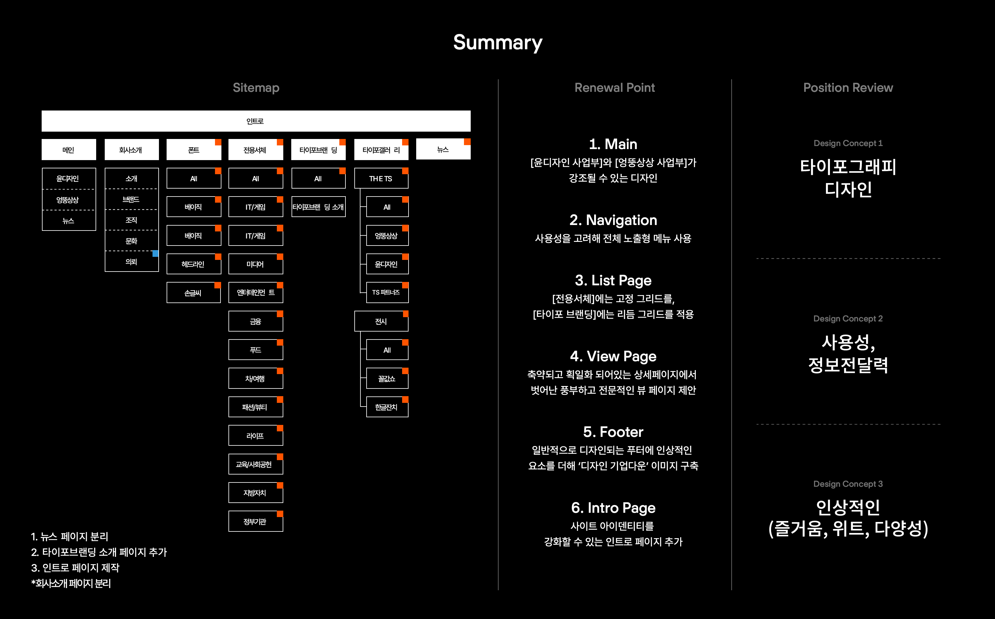 설문조사 결과를 분석하고 리뉴얼 방향성을 잡았다. 최대한 간결하고 명료하게, 방향성을 다섯 가지로 요약했다. 이 방향성은 추후 사이트 개발 업체와도 공유해야 하므로 복잡하고 번잡한 내용이면 소통이 어려워질 것이었다.