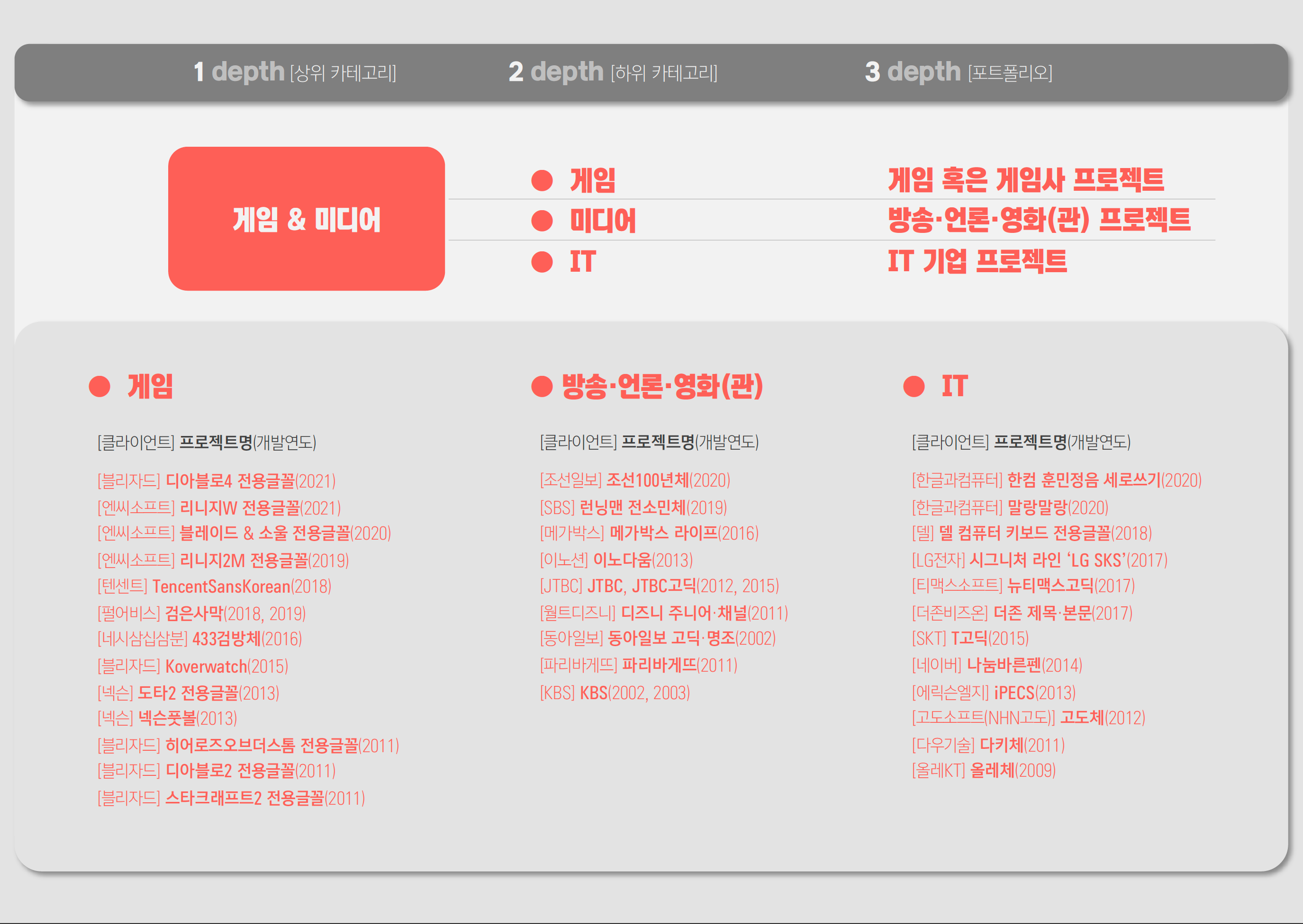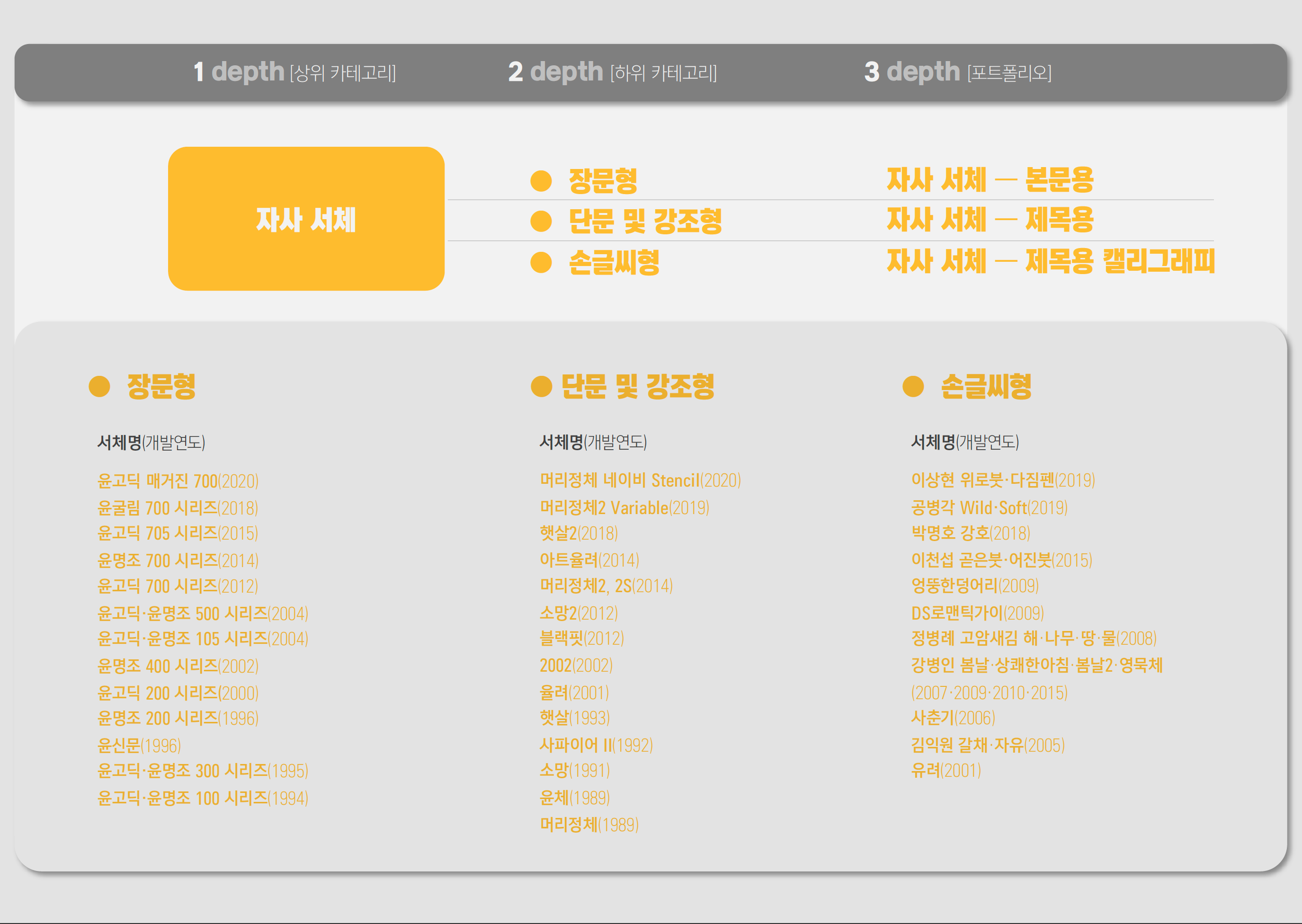 미디어콘텐츠팀, TDC, 엉뚱상상 등 3개 부서는 새단장할 사이트의 포트폴리오 대분류를 ❶폰트 ❷전용서체 ❸타이포 브랜딩으로 간소화하기로 협의했다. ❶·❷를 TDC가 맡고 ❸을 엉뚱상상이 맡기로 했다. 방대한 포트폴리오 데이터를 지금의 회사 경영 방침에 맞춰 재분류하고, 각각의 메타 데이터(프로젝트 진행 연도, 참여자, 수상 실적 등 정보) 또한 전부 새로 쓰기로 했다. 메타 데이터의 분량과 양식은 미디어콘텐츠팀이 정하여 예시 자료와 함께 각 부서에 공유했다.