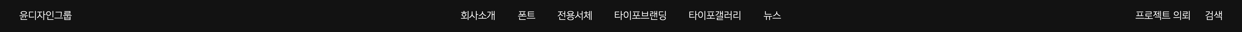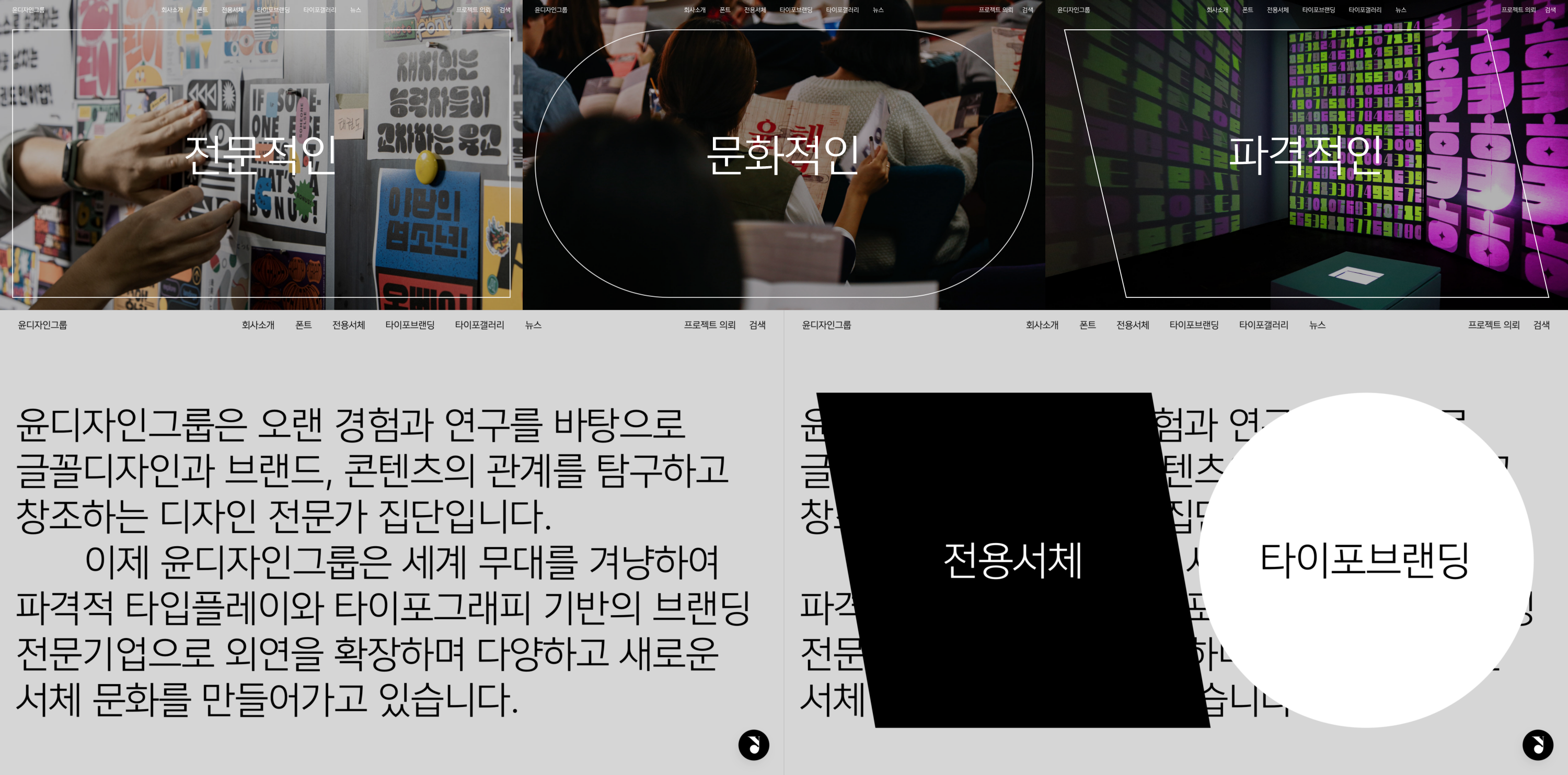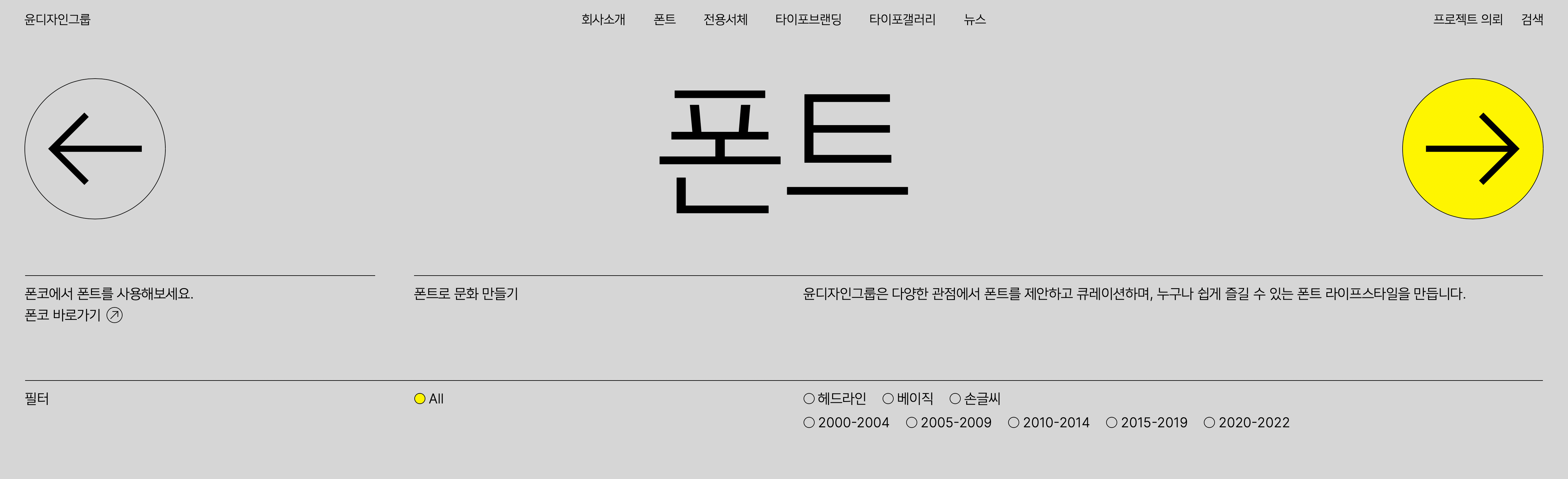 맞습니다. 이번 리뉴얼을 시작한 근본적인 원인이기도 해요. 기존 홈페이지는 ‘폰트 기업’의 공간이었어요. 새 홈페이지는 ‘타이포 브랜딩 기업’의 공간이어야 했습니다. 그렇다고 폰트 기업의 정체성을 아예 내려놓은 건 아니거든요. ‘폰트만 만들던 기업에서 폰트로 브랜딩도 하는 기업으로, 궁극적으로 폰트 문화를 형성하는 기업으로’. 아마도 이 문장이 현재 윤디자인그룹의 경영 노선과 가장 부합할 것입니다.
