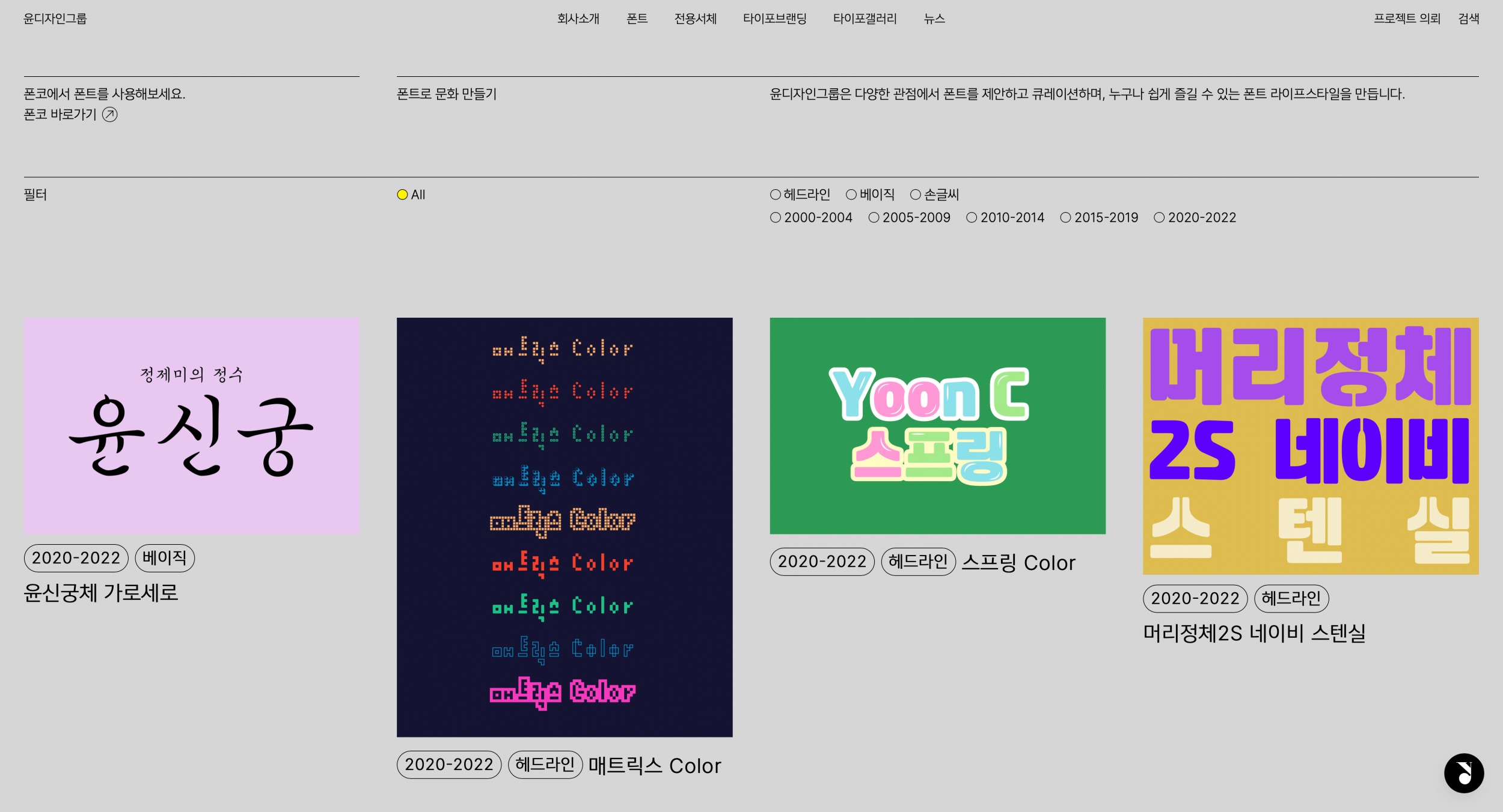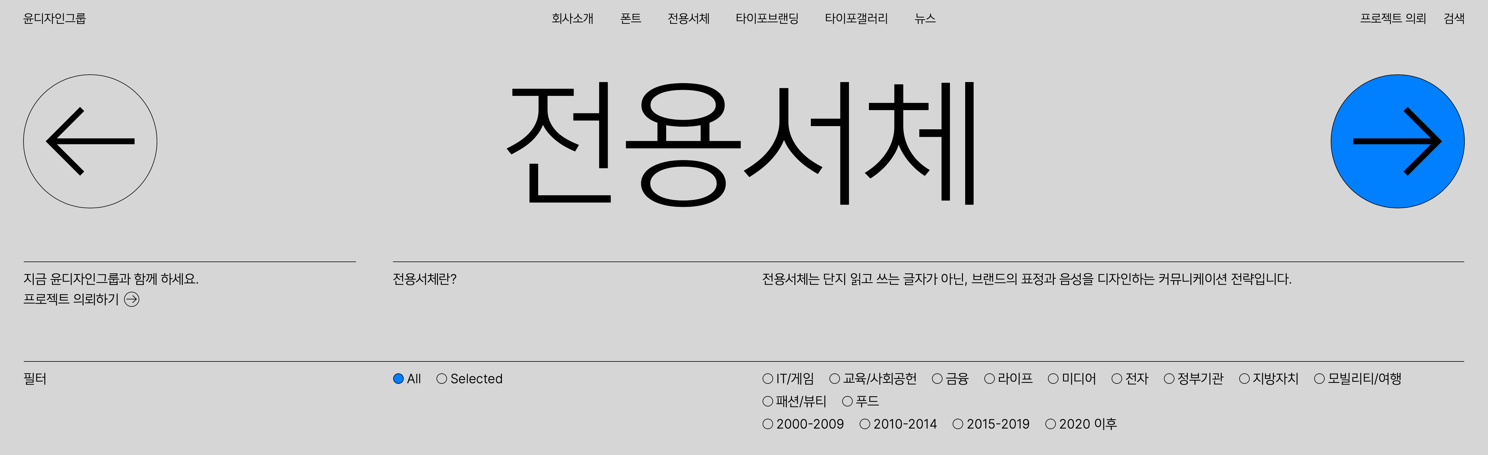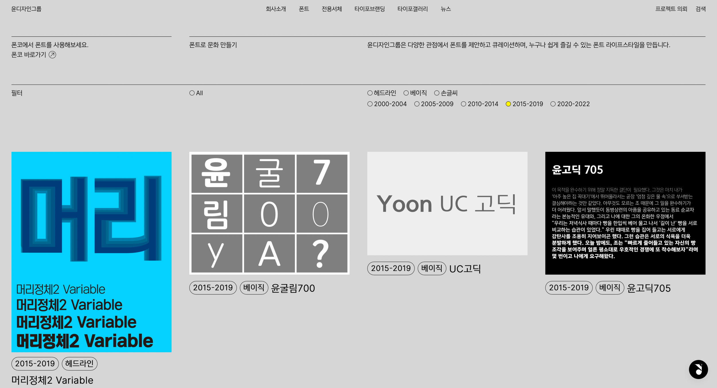 맞습니다. 이번 리뉴얼을 시작한 근본적인 원인이기도 해요. 기존 홈페이지는 ‘폰트 기업’의 공간이었어요. 새 홈페이지는 ‘타이포 브랜딩 기업’의 공간이어야 했습니다. 그렇다고 폰트 기업의 정체성을 아예 내려놓은 건 아니거든요. ‘폰트만 만들던 기업에서 폰트로 브랜딩도 하는 기업으로, 궁극적으로 폰트 문화를 형성하는 기업으로’. 아마도 이 문장이 현재 윤디자인그룹의 경영 노선과 가장 부합할 것입니다.