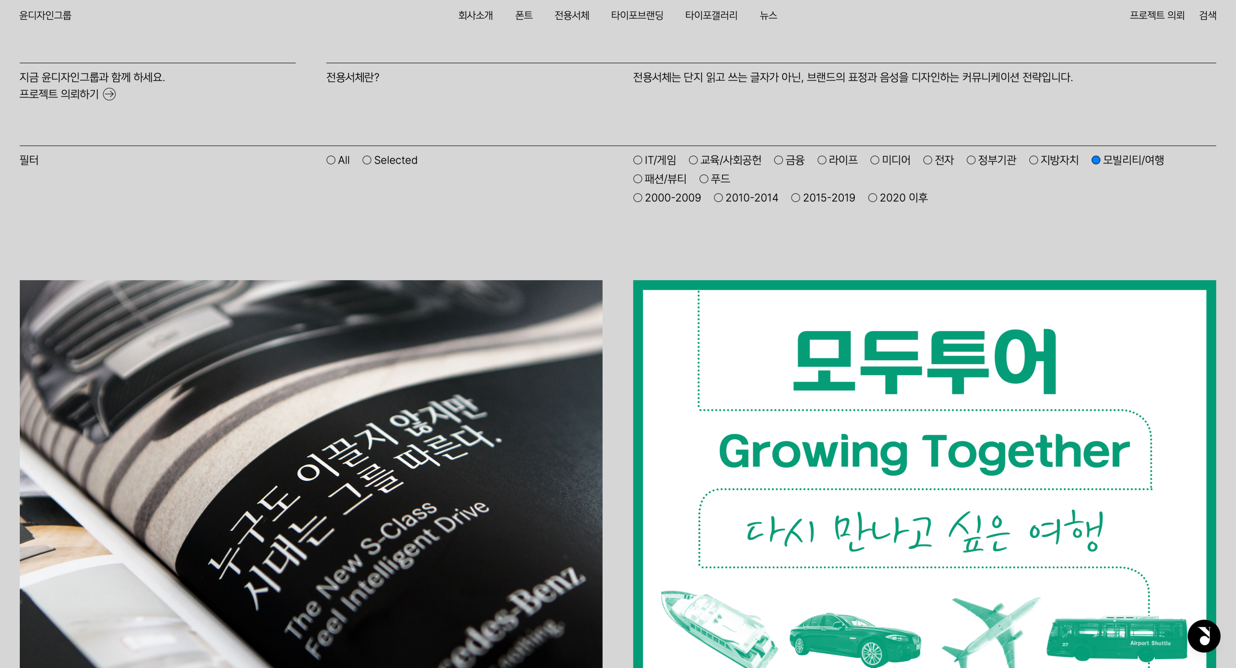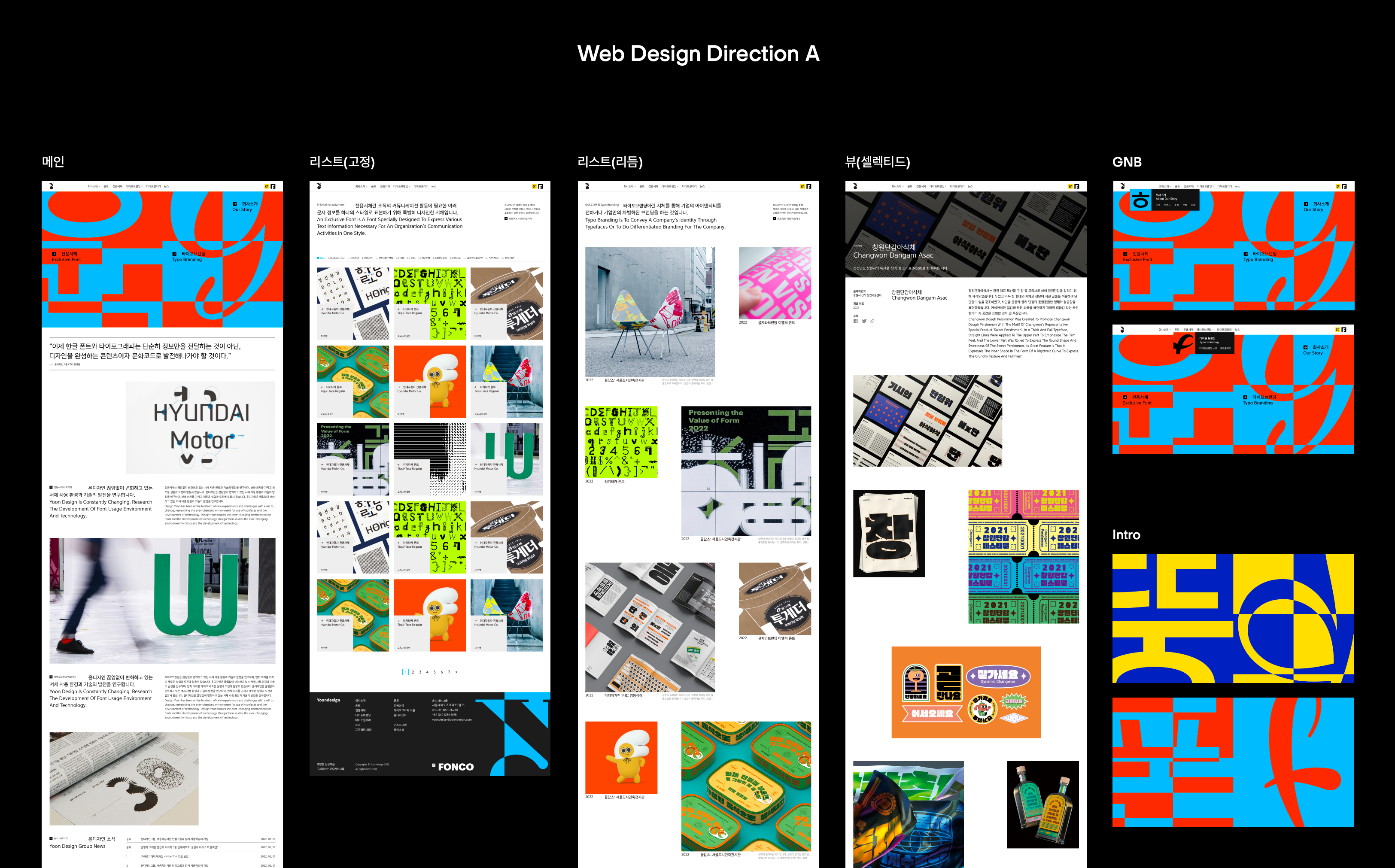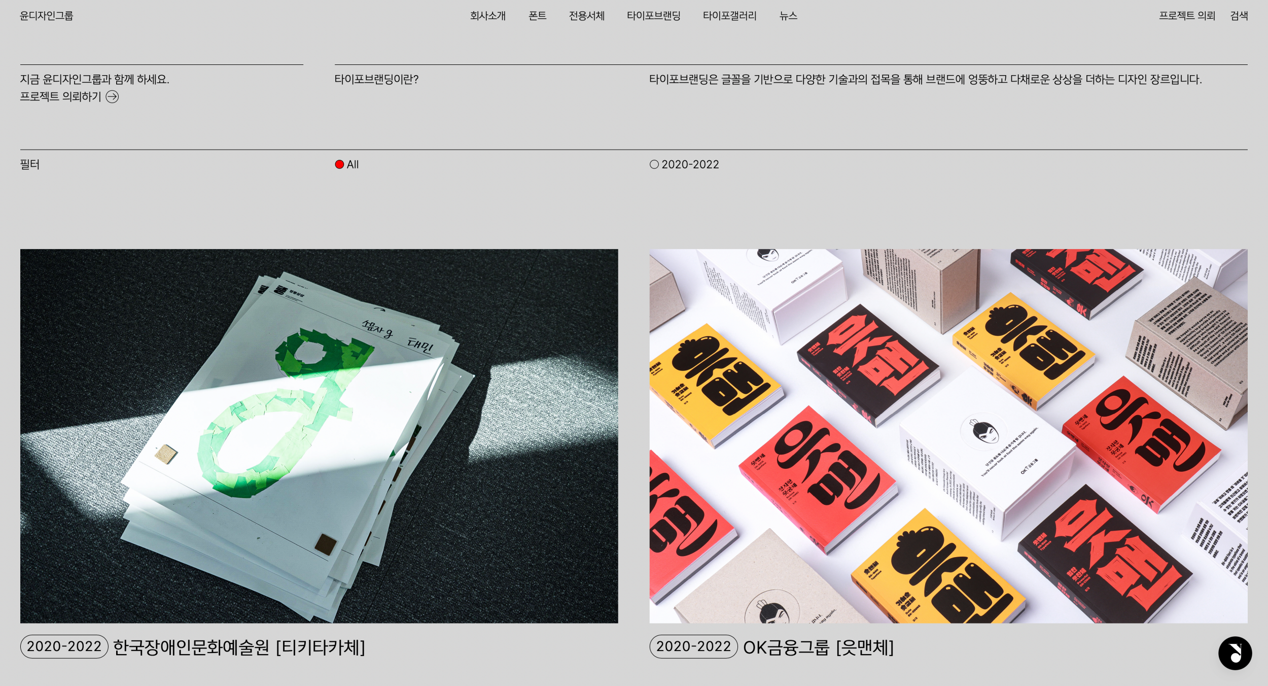 웹 사이트 사용성과 사이트 전반에 타이포그래피가 잘 녹아들었는가. 이 점을 가장 무겁게 고려했습니다. 윤디자인그룹의 본질이자 시작점이 타이포그래피잖아요. 그래픽 요소나 다양한 컬러 속에서도 타이포그래피가 흐려지지 않도록, 탄탄한 기본기가 보이도록 특별히 신경썼습니다.