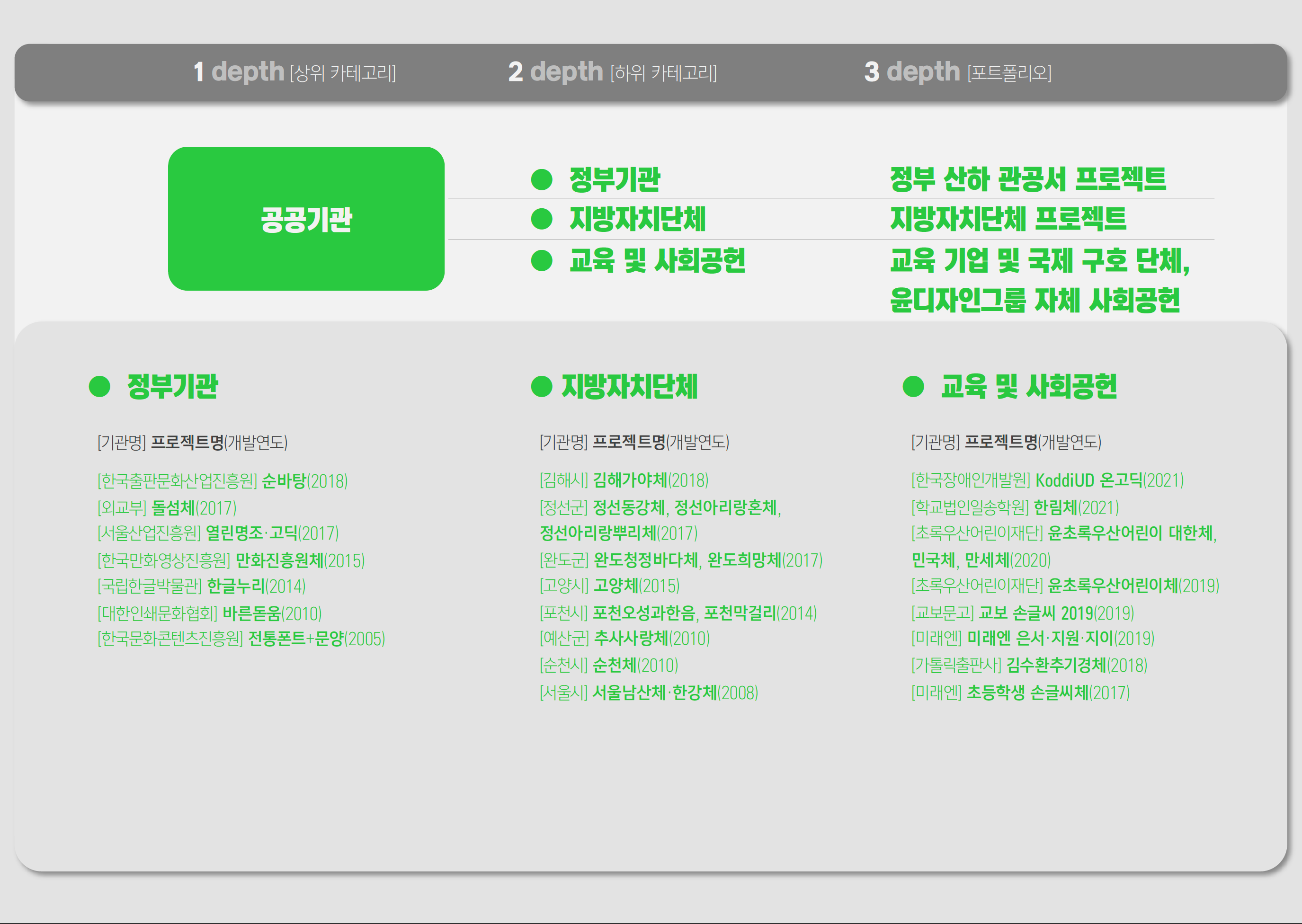 설명하기 말고 보여주기. 이게 관건이었던 것 같아요. 영화 홍보 카피가 아무리 좋아도 결국 알맹이는 영화 자체잖아요. 윤디자인그룹이 어떤 기업인지 가장 잘 드러내는 건 역시 디자인 결과물이겠죠. 그래서 포트폴리오를 큼직하고 시원하게, 작업 분야별로 일목요연하게 게시하는 것을 핵심 과제로 삼았어요.
