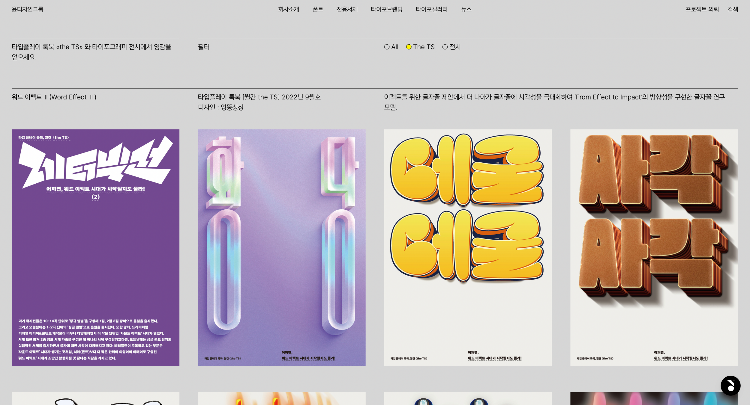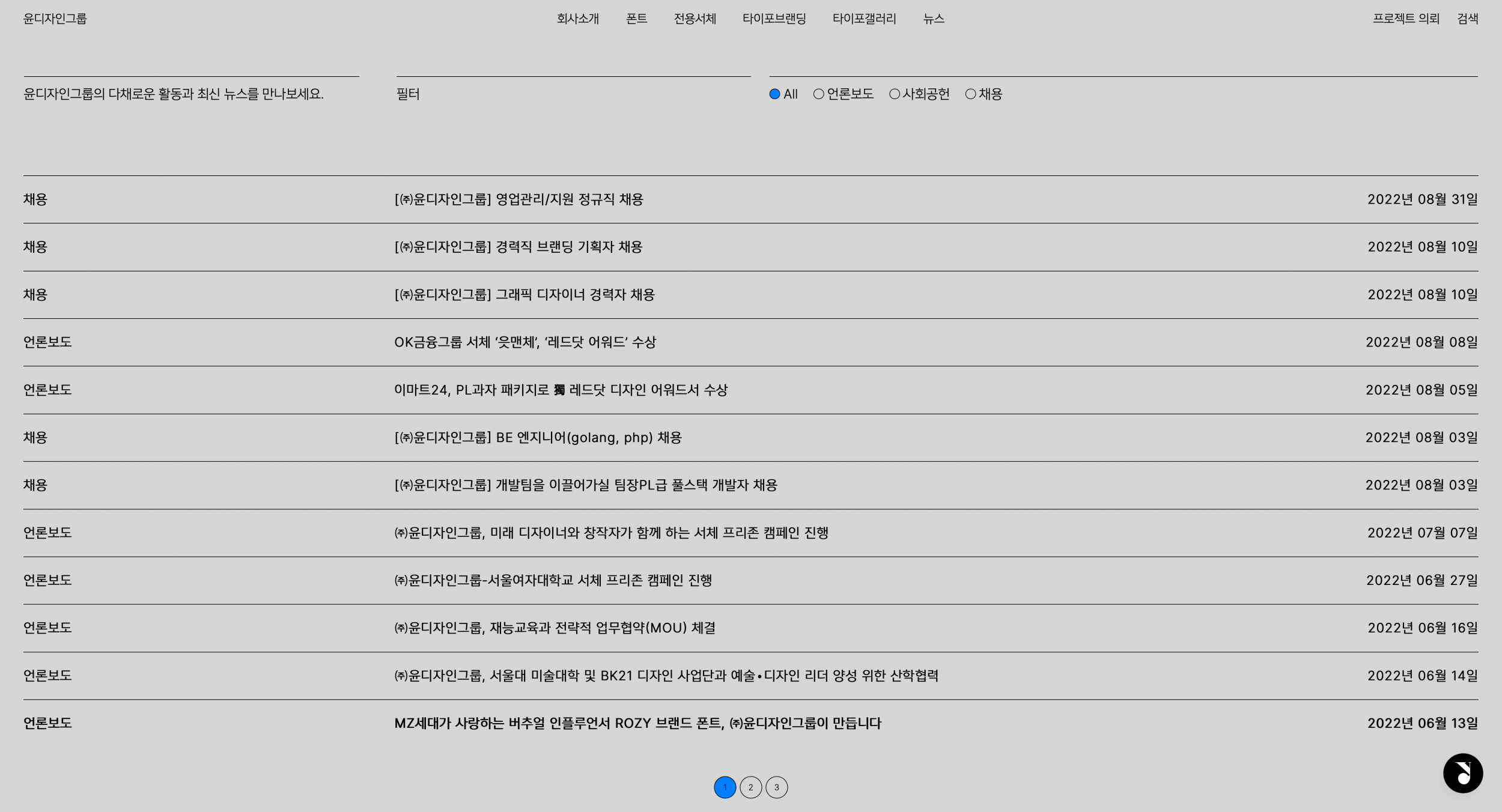 구조, 기능, 외관, 관리 체계 등이 전면 개편되었어요. 한마디로 도메인 빼고 다 바뀌었습니다. 새단장 이후 윤디자인그룹의 ‘세 가지’가 더욱 선명하게 사이트에 새겨졌습니다. 첫째, 타이포 브랜딩(typo-branding) 기업으로서의 정체성. 둘째, 1989년 설립 이래 30여 년간 축적해 온 글자와 타이포그래피(type & typography) 전문성. 셋째, 윤디자인그룹 사람들.