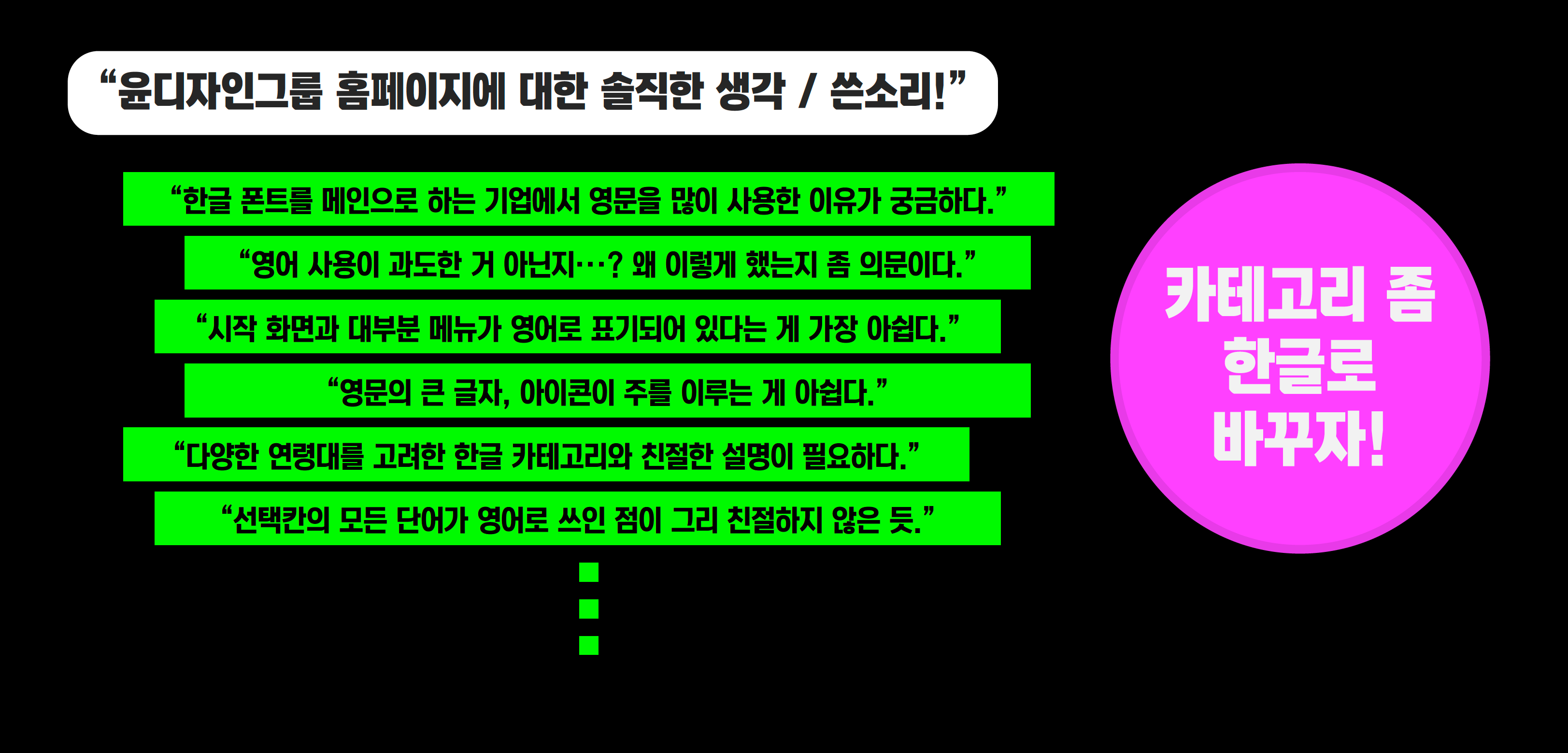 사내 임직원들에게 설문조사 결과를 공유했다. 우리 팀처럼 다들 놀랐다. ‘카테고리명을 한글로 개선하자’라는 요구가 제일 많았기 때문이다. 회사 내부에서는 단 한 번도 제기된 적 없는 이슈였다. “한글 폰트를 메인으로 하는 기업에서 (사이트에) 영문을 많이 사용한 이유가 궁금하다”라는 응답에 눈이 부셨다. 회사 안의 우리가 미처 보지 못한 ‘등잔 밑’이 문장으로 밝혀져 있었다. 섬광 같은 문장이었다.