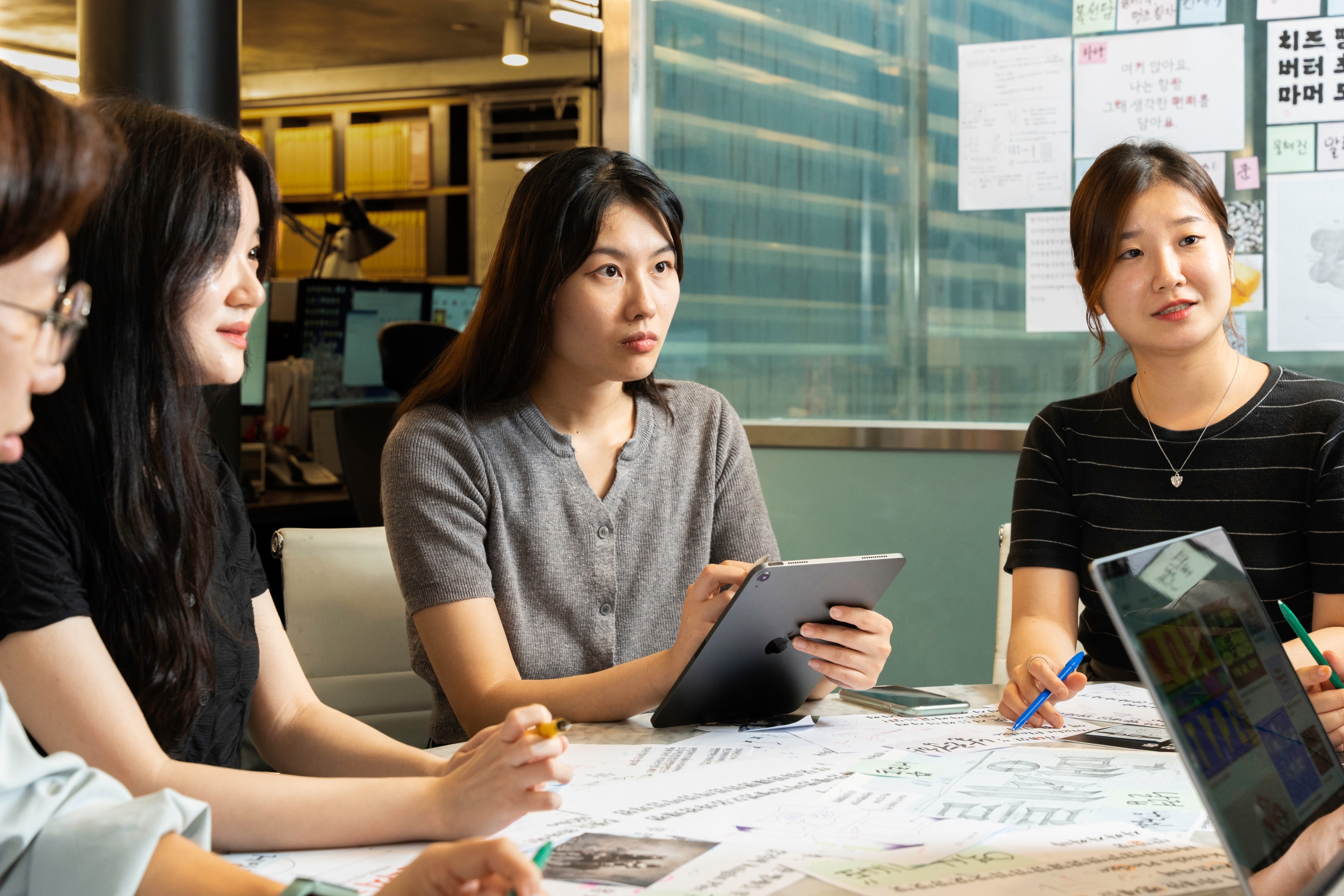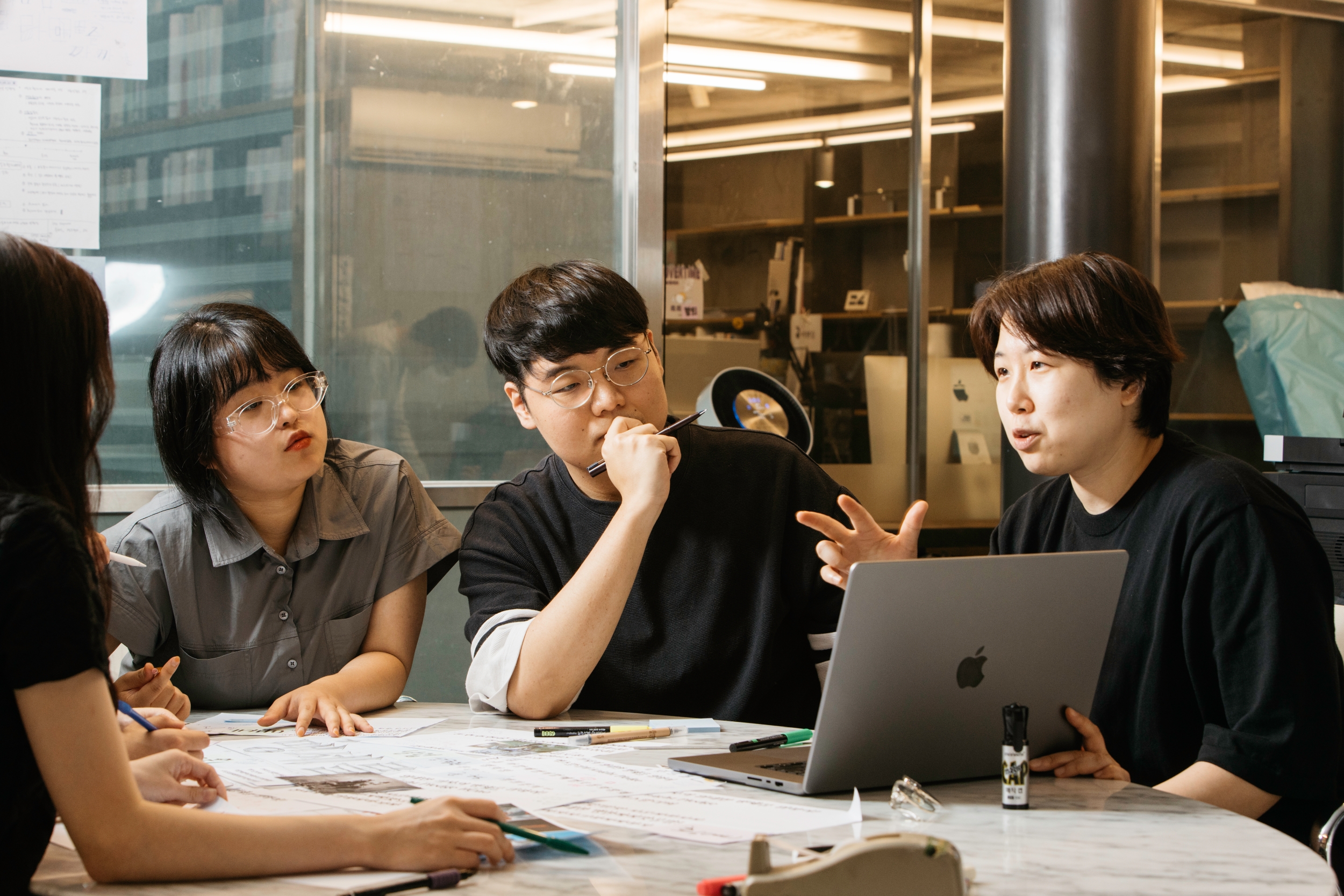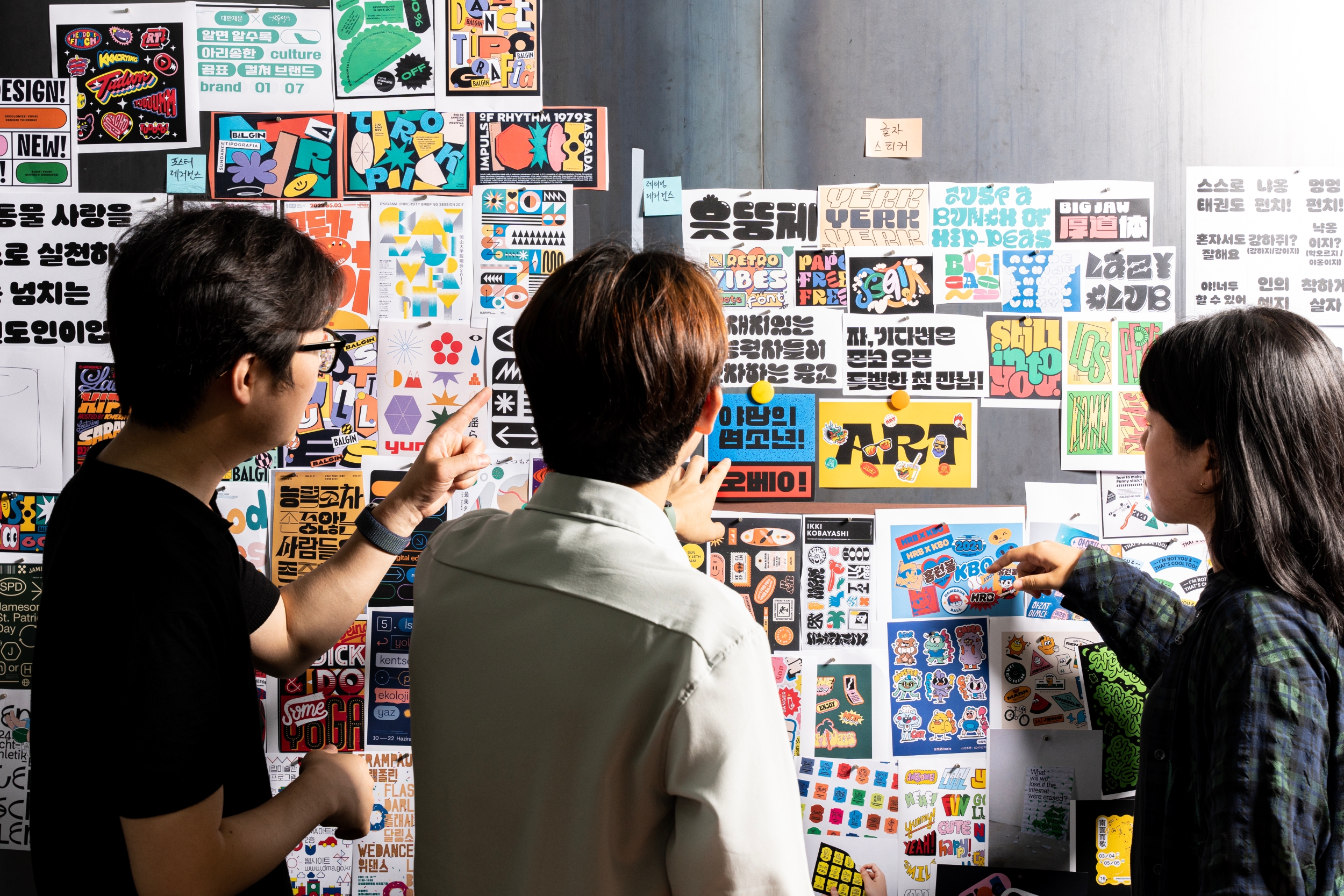 저희가 늘 회의 때만 만나서 결과물(시안) 이야기만 했잖아요. 과정 얘기도 들어보고 싶네요. 세 분의 협업 방식이 궁금합니다.