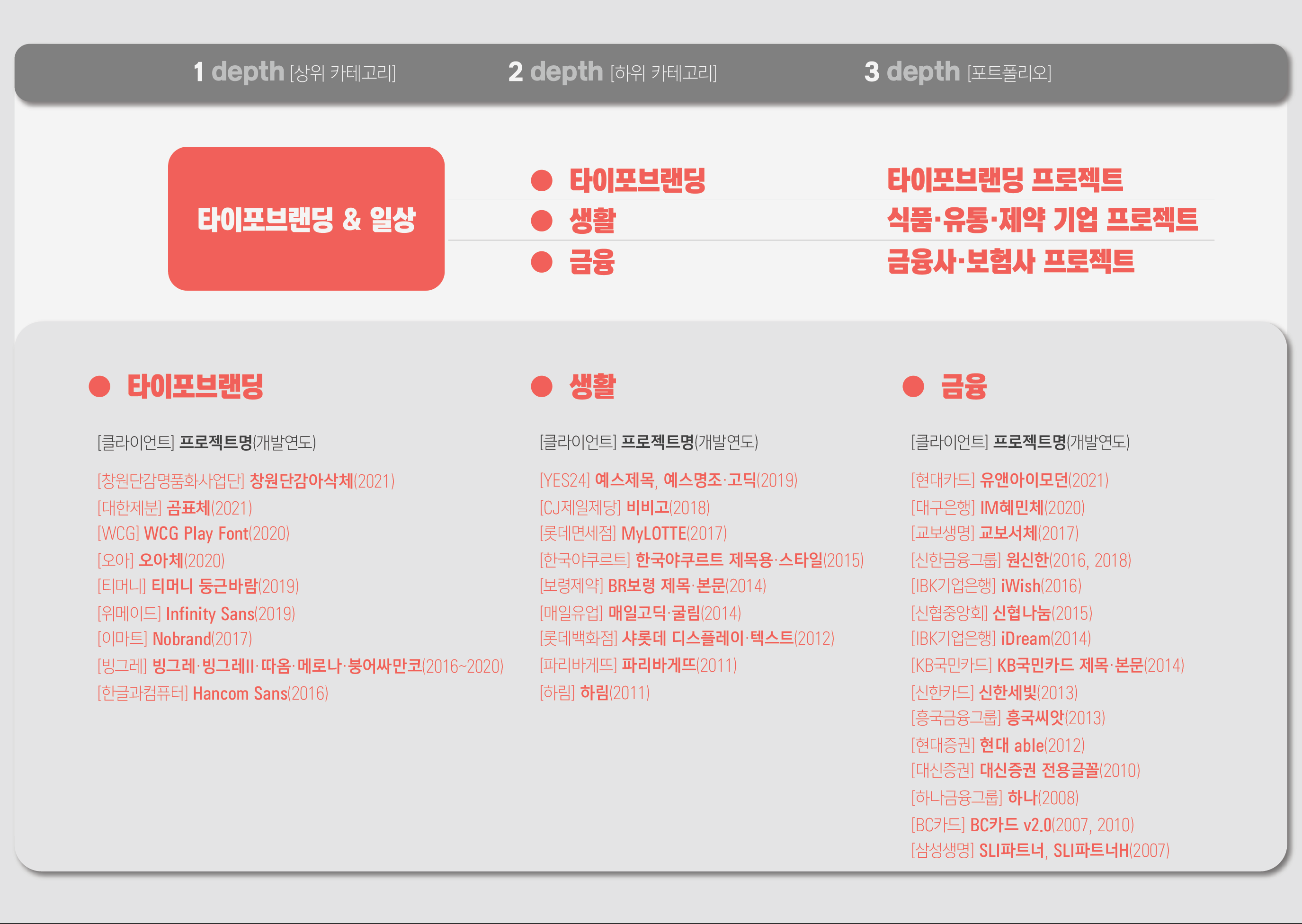 ‘폰트 기업’에서 ‘타이포 브랜딩 기업’으로 전환한 회사의 경영 방침을 홈페이지에 반영하는 게 난제였을 것 같습니다.