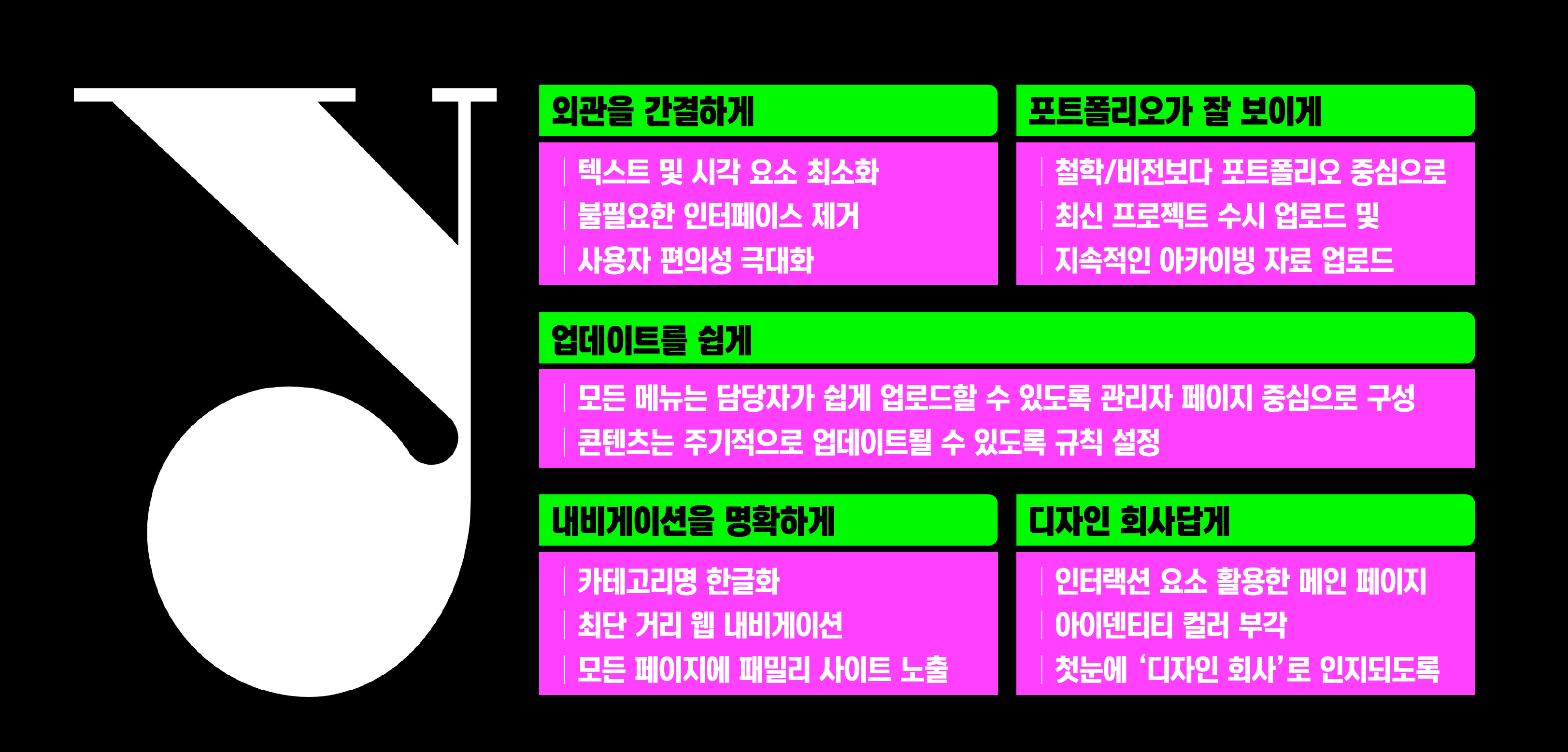 직원들이 직접 포트폴리오를 게시 및 수정할 수 있게 체계화하는 것도 중요했습니다. 프리랜스 디자이너들이 개인 사이트를 꾸준히 업데이트하듯, 윤디자인그룹 사람들이 지속적으로 회사 홈페이지를 관리하는 거죠. 그래야만 사이트가 정체되지 않고 계속 살아 움직일 테니까요.