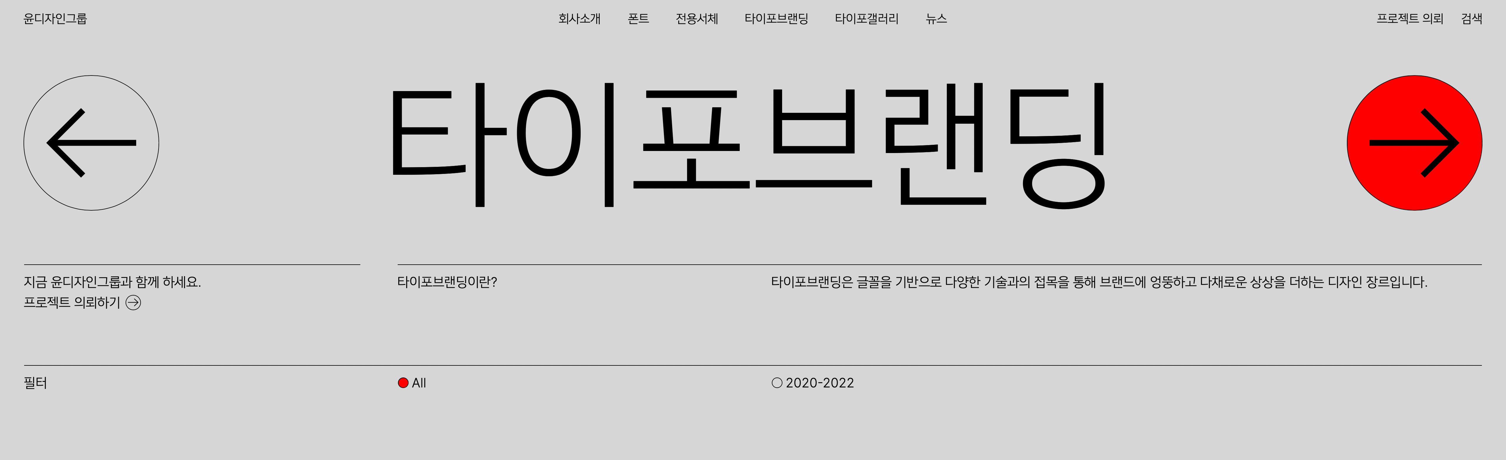 맞습니다. 이번 리뉴얼을 시작한 근본적인 원인이기도 해요. 기존 홈페이지는 ‘폰트 기업’의 공간이었어요. 새 홈페이지는 ‘타이포 브랜딩 기업’의 공간이어야 했습니다. 그렇다고 폰트 기업의 정체성을 아예 내려놓은 건 아니거든요. ‘폰트만 만들던 기업에서 폰트로 브랜딩도 하는 기업으로, 궁극적으로 폰트 문화를 형성하는 기업으로’. 아마도 이 문장이 현재 윤디자인그룹의 경영 노선과 가장 부합할 것입니다.