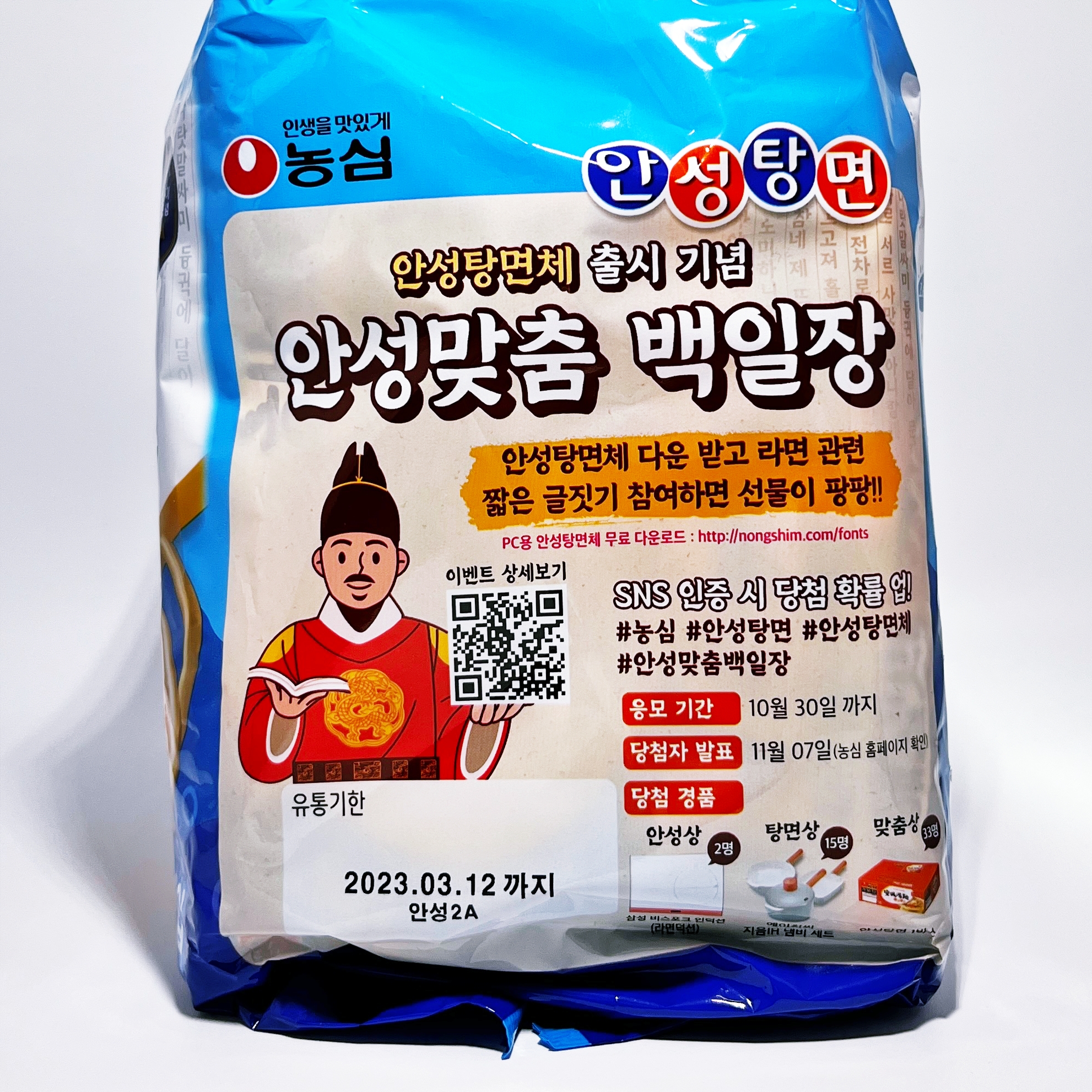 최근 새롭게 개발된 안성탕면체는 농심 홈페이지에서 무료로 다운로드 받아 사용할 수 있도록 배포하고 있습니다. 한글날 이벤트로 라면에 관련된 30자 글짓기를 하는 ‘안성맞춤 백일장’도 열리고 있죠.