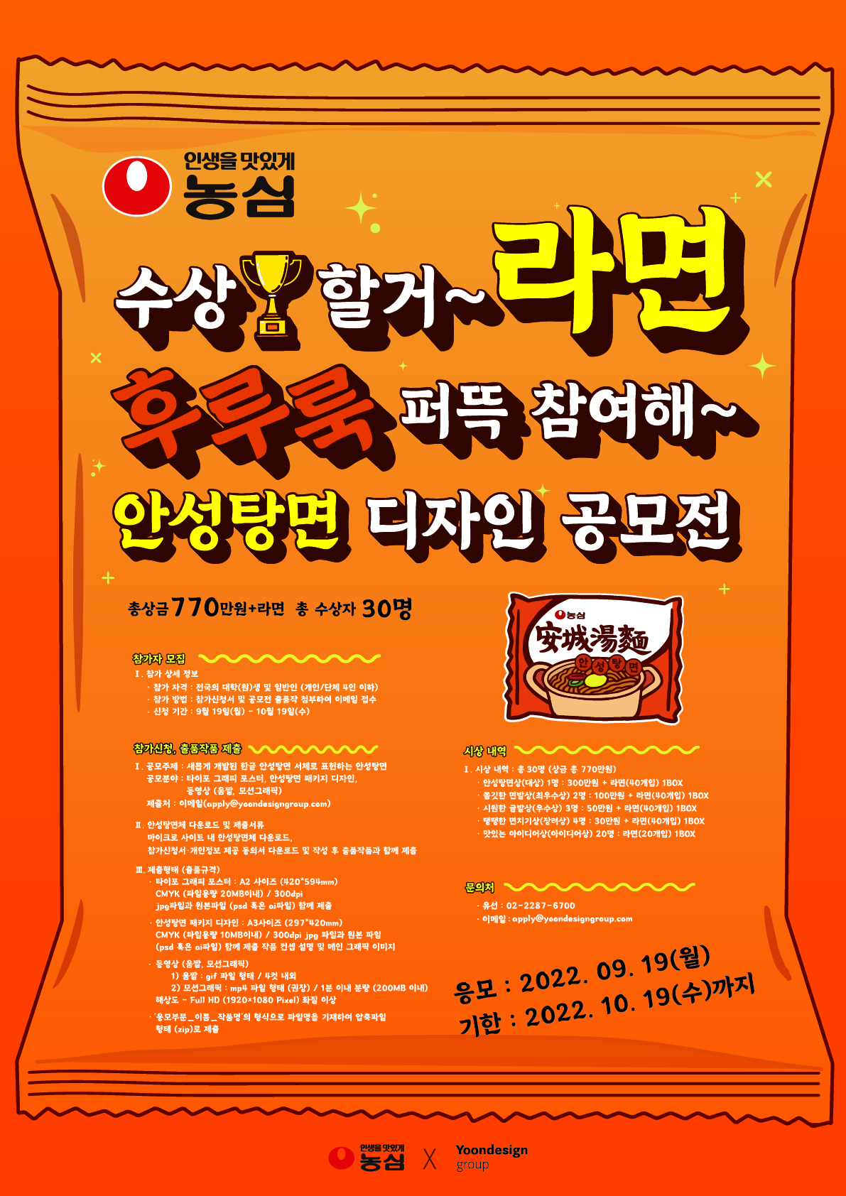 농심과 윤디자인그룹이 ‘안성탕면체를 활용한 타이포 디자인 공모전’을 함께 진행합니다.