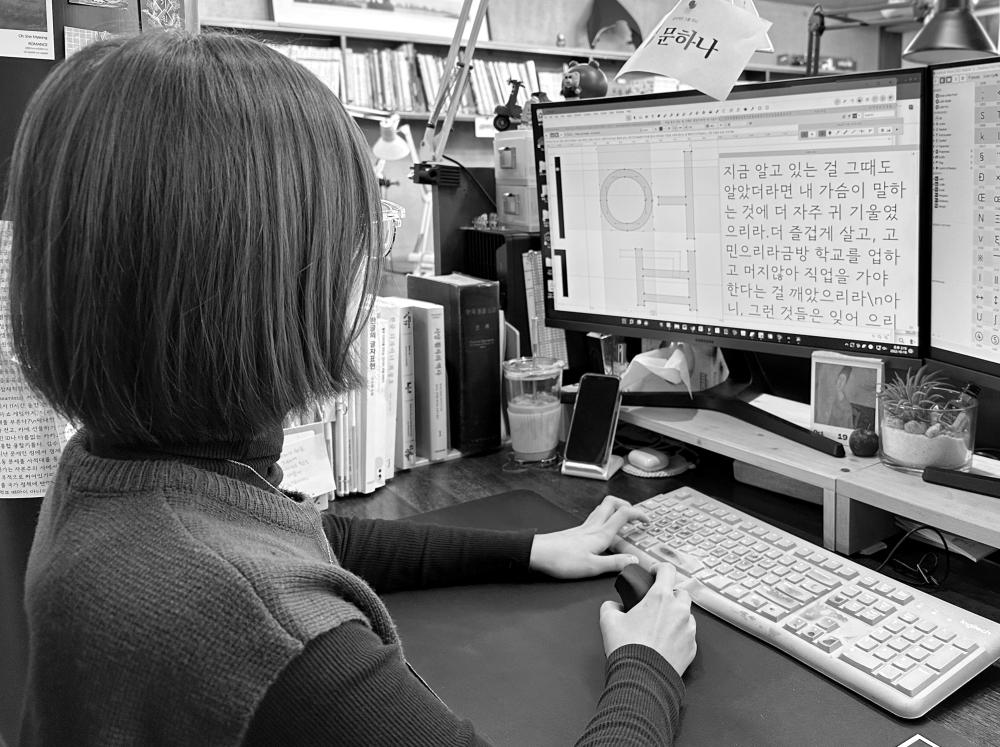 글자는 워낙 수가 많잖아요. 한글만 최소 2,350자에서 최대 11,172자, 그리고 그 외 영역들까지···. 작업하다가 가끔은 ‘수정하지 말고 그냥 진행할까’ 하는 마음이 들기도 합니다. 악마의 속삭임입니다.(웃음) 그럴 때마다 정조 이산의 위 말씀을 아로새깁니다. ‘이게 최선이니?’ 하며 채찍질을 해요. 그리고 ‘수정할 수 있을 때 수정하는 건 다행이야’라는 마음으로 다시 차근차근 수정에 들어갑니다. 계속 이 마음의 반복이에요.