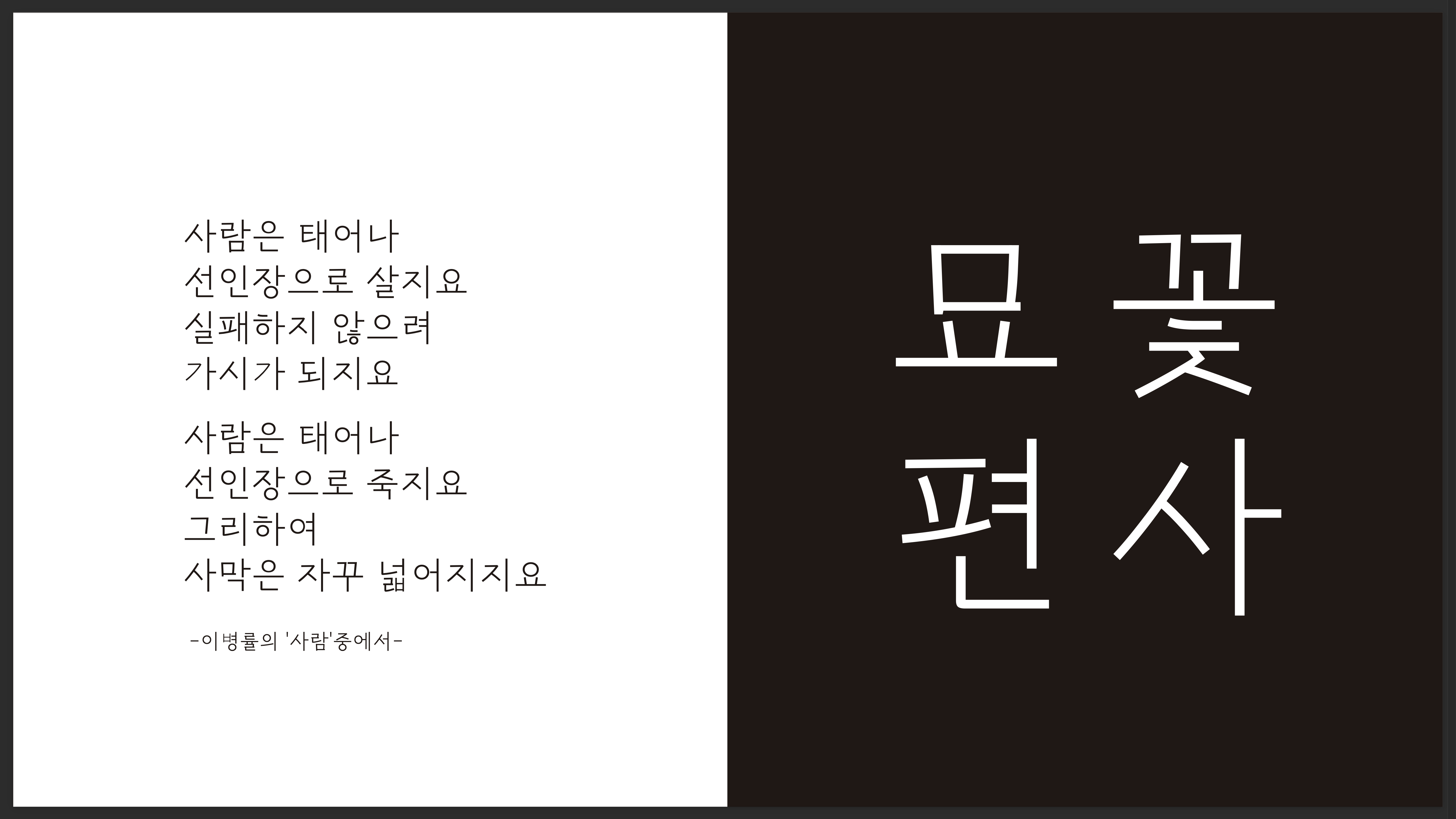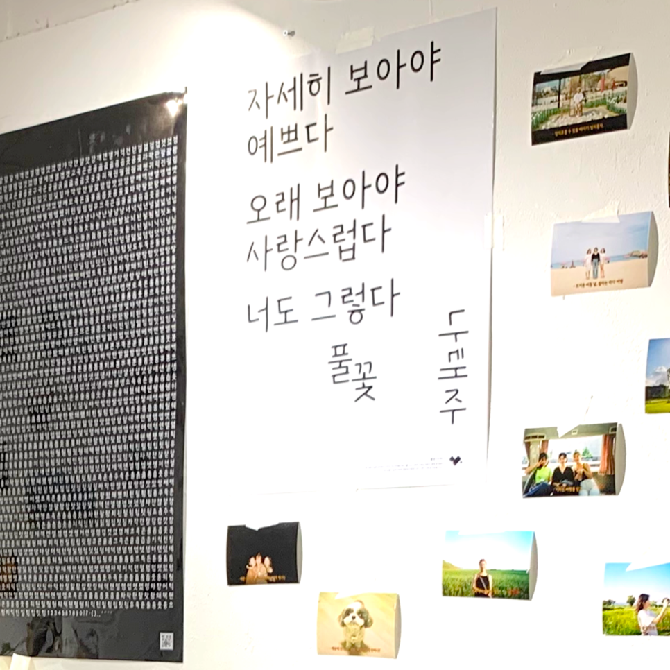 당시 저는 나태주 시인의 「풀꽃」이라는 시에 빠져 있었거든요. 나태주 시인이 원래 교육자셨고, 이 시가 스승이 제자에게 주는 마음이라는 걸 알았어요. 교생 실습을 마친 지 얼마 안 됐을 때라 시가 참 와 닿았습니다. [문하나체]로 쓴 「풀꽃」 포스터를 졸업전시에 선보이고 싶었어요. 직접 나태주 시인께 연락을 드려 시구 전재를 허락 받았습니다.