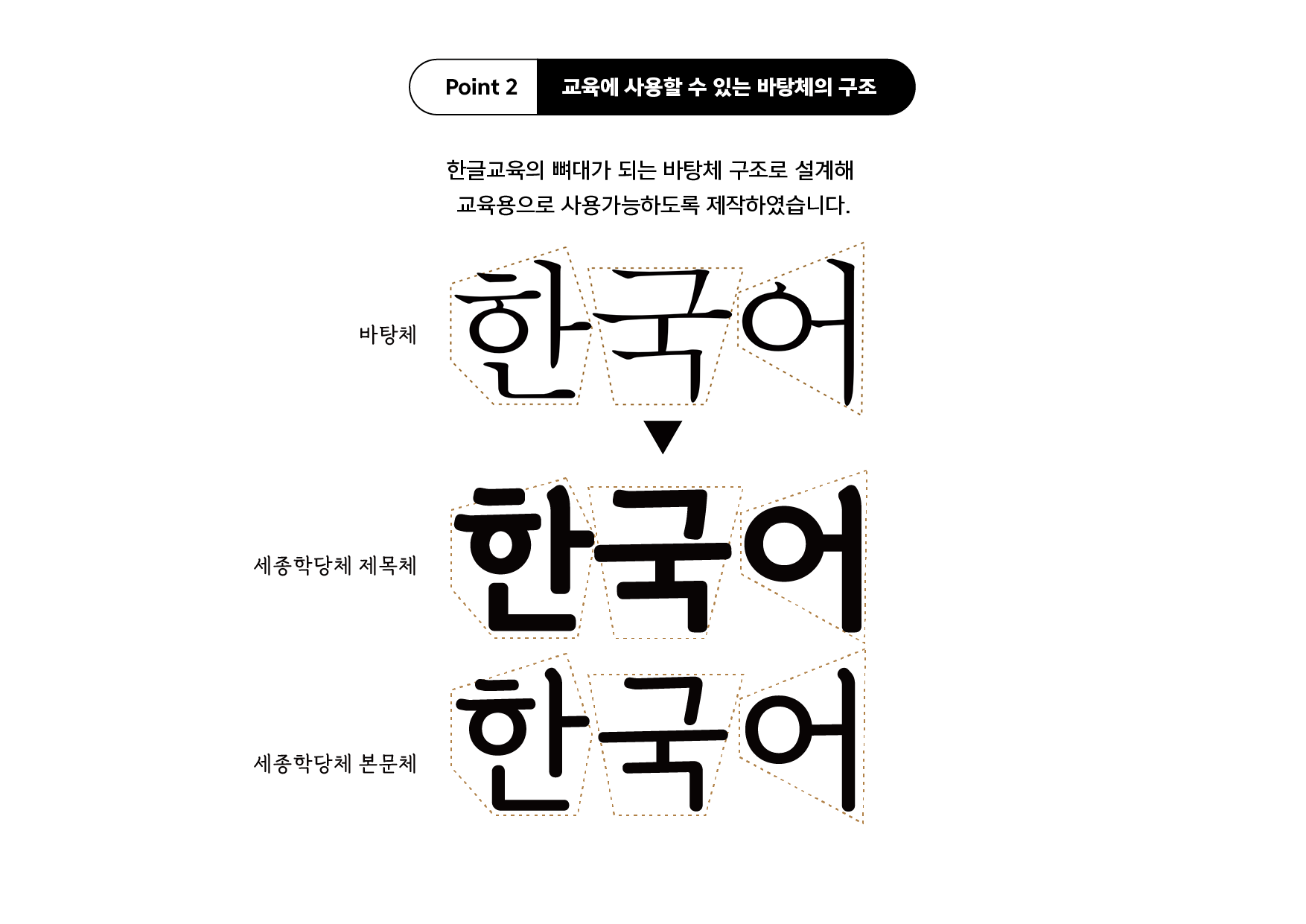「세종학당체」는 총 2종으로 ‘세종학당 제목체’와 ‘세종학당 본문체’로 구성되어 있어요. 지난 10년 동안 세계에 한글을 널리 알려온 세종학당체의 마음을 담아 디자인했죠.